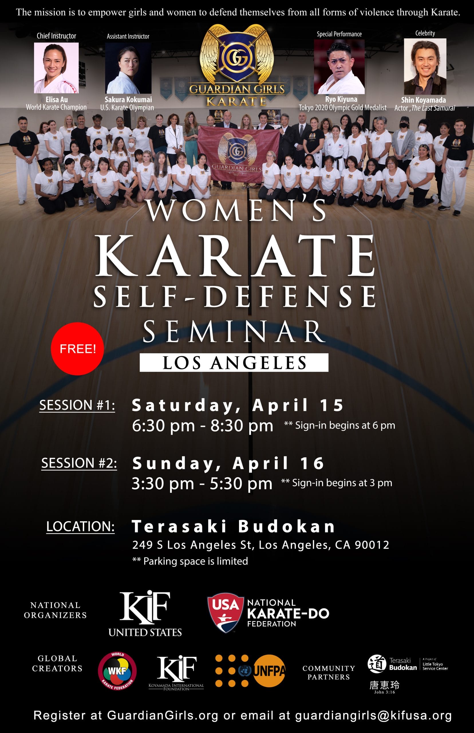 LOS ANGELES, April 05, 2023 (GLOBE NEWSWIRE) — In a global effort to combat gender-based violence, the USA National Karate-do Federation (USA-NKF) and the Koyamada International Foundation USA (KIF USA) will launch the “Guardian Girls Global Karate Project” in Los Angeles, bringing together diverse communities of women from the Greater Los Angeles area for a two-day Guardian Girls Women’s Karate Self-Defense Seminar in Los Angeles. The seminar will be taught by USA Karate Elisa Au, a three-time World Karate Champion and current USA Karate Chairperson, and by Ms. Sakura Kokumai, U.S. Karate Olympian. The event will be held Saturday, April 15 from 6:30 pm to 8:30 pm and Sunday, April 16 from 3:30 pm to 5:30 pm at the Terasaki Budokan in Downtown Los Angeles. The event is free. Online registration and more details are available at GuardianGirls.org
