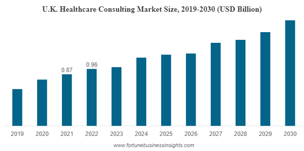 As per the report by Fortune Business Insights, The UK healthcare consulting market size was valued at USD 0.96 billion in 2022 and is predicted to reach USD 1.04 billion in 2023. The market is anticipated to touch USD 1.87 billion by 2030, recording a CAGR of 8.8% during the forecast period of 2023-2030.
