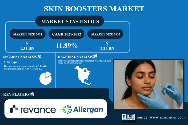 Austin, Sept. 22, 2025 (GLOBE NEWSWIRE) — According to S&S Insider, the global Skin Boosters Market was estimated at USD 1.31 billion in 2024 and is expected to reach USD 3.25 billion by 2032, registering a CAGR of 11.89% from 2025 to 2032. This exponential growth is driven by increasing customer preference for non-surgical aesthetic procedures that improves hydration, elasticity and smoothness in the skin. Preventative skin care, powered by regenerative actives, such as hyaluronic acid (HA), exosomes and polydeoxyribonucleotides (PDRN) is changing the world of beauty and dermatology.